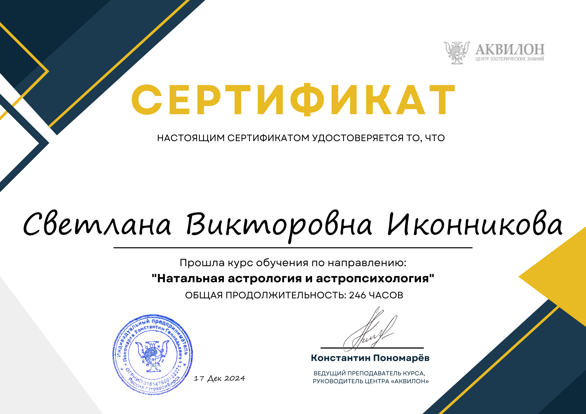 Закончился 1-й год курса, он был интересным, насыщенным не только самой тематикой, но и дополнительными материалами, которые руководитель и лектор Константин Пономарёв давал в изобилии. Поскольку я в теме астрологии давно, но занимался в основном философско-эзотерической тематикой теоретически, астрологической практики было очень мало и не всё было известно, поэтому я смотрел где можно ещё пополнить запас знаний и навыков, поэтому выбрал курсы в "Аквилон", до курса астрологии прошёл курс А. Колесникова по нумерологии. Смотрел и другие курсы, которые при возможности тоже хотел изучить, интересов много, а возможностей пока не столько, сколько хотелось бы. Жду продолжение, особенно прогностику.